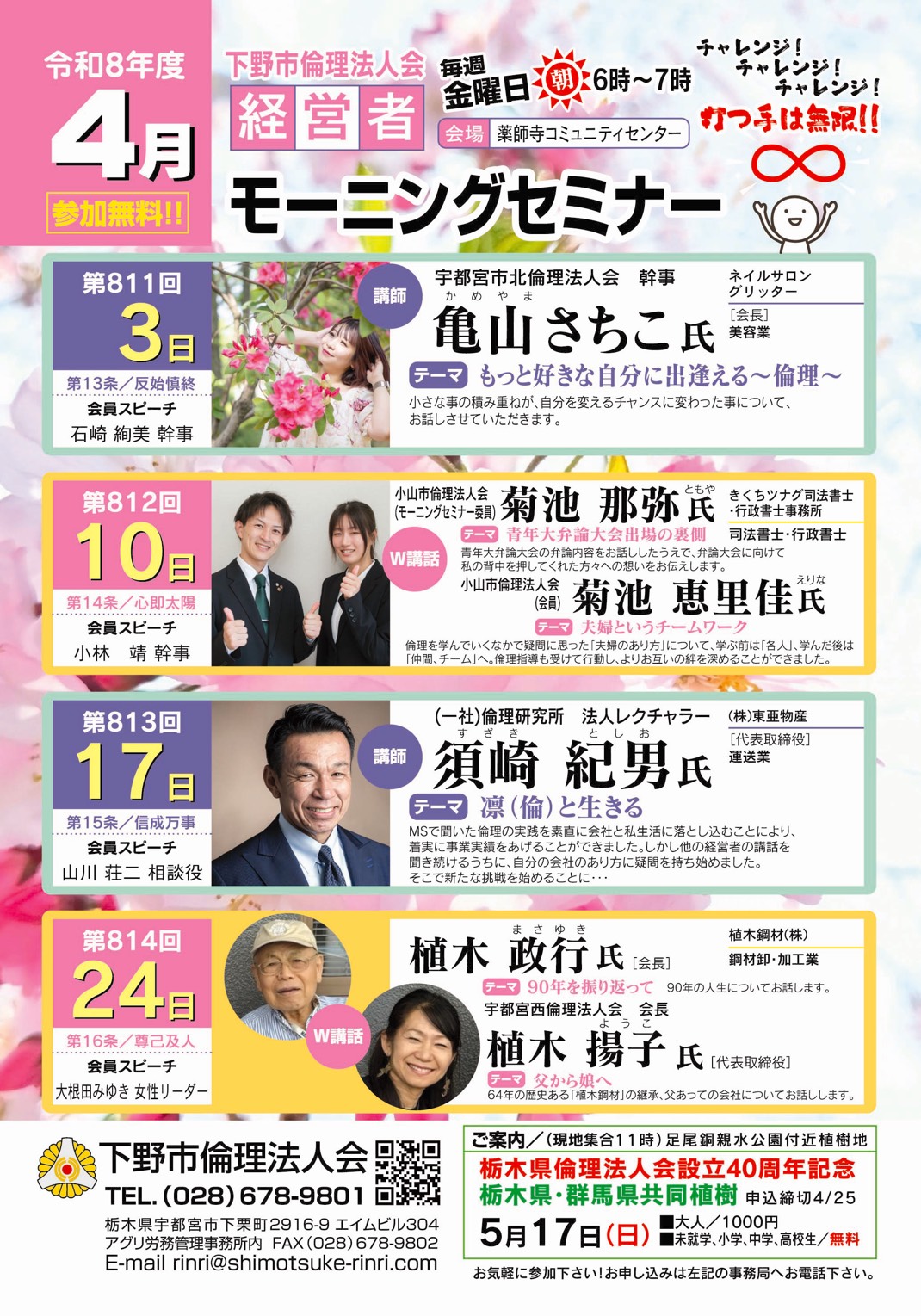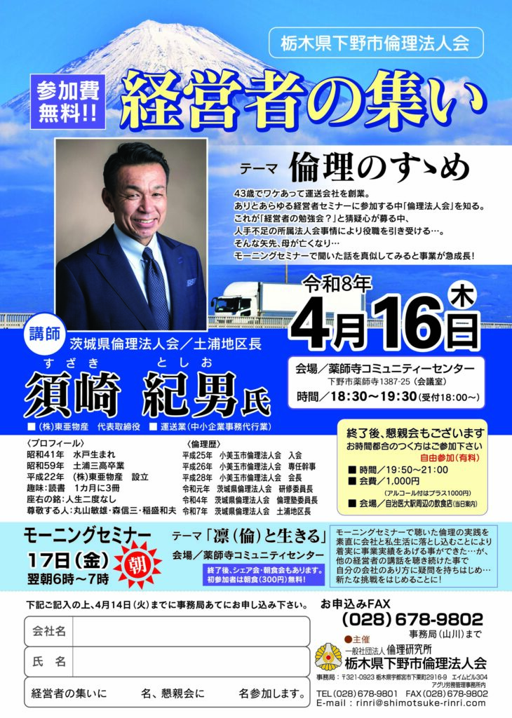 全国各地から倫理法人会所属の経営者を講師に招き、